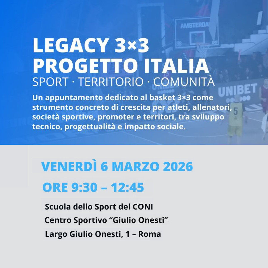 Si terrà il 6 marzo a Roma, presso la Scuola dello Sport del Centro di Preparazione Olimpico “Giulio Onesti” (ore 9:45), Legacy 3×3 – Progetto Italia, un evento dedicato al confronto sul movimento del basket 3×3.